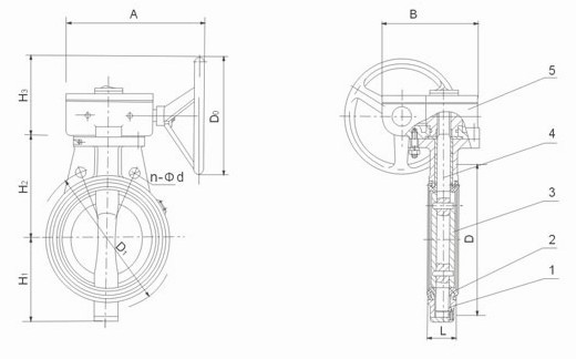 部件列表:1、阀体 2、阀座 3、蝶板 4、阀杆 5、蜗轮装置